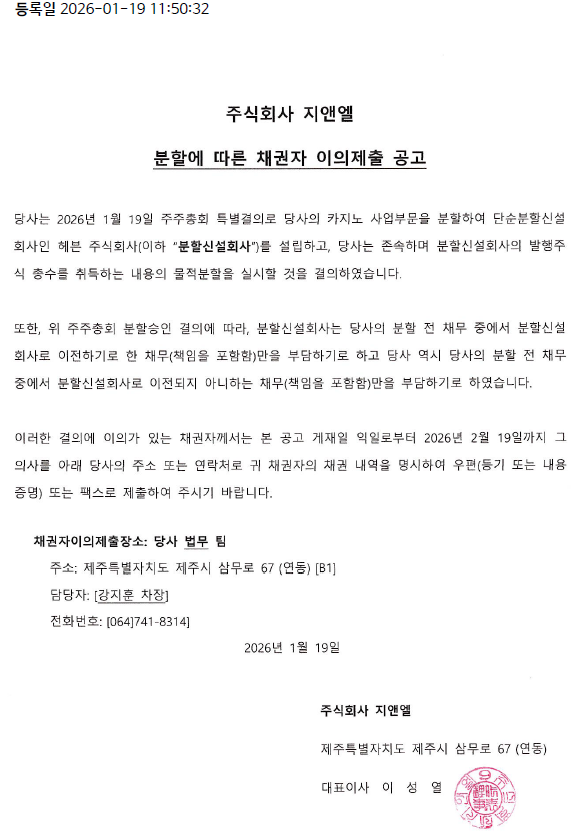 (주)지앤엘 분할에 따른 채권자 이의 제출 공고